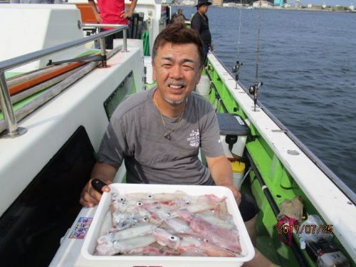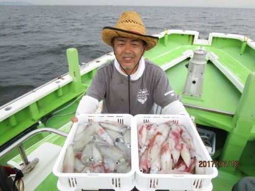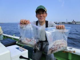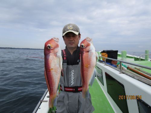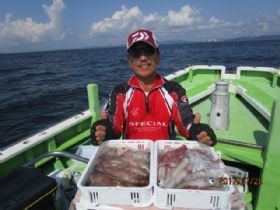 アマダイ船。保田沖から金谷沖を転々と狙い、風弱く海上穏やかで良い天気でした。 1日を通してあまり潮が流れず外道のアタリ少なく、各ポイントで本命は船中ポツリと顔見れるものの単発で、サイズは中型主体に良型&大型44cm混じりで終日ポツリポツリの拾い釣りでした。 トップは中・良型揃いに大型44cm含み5尾、2番手4尾、オデコ無く全員ゲット出来ました!