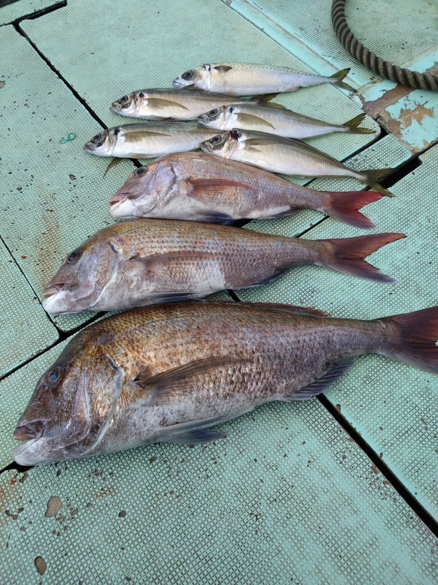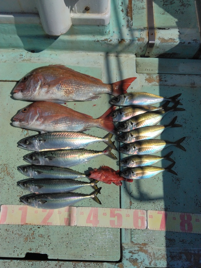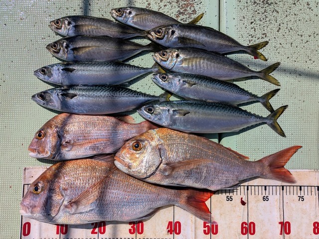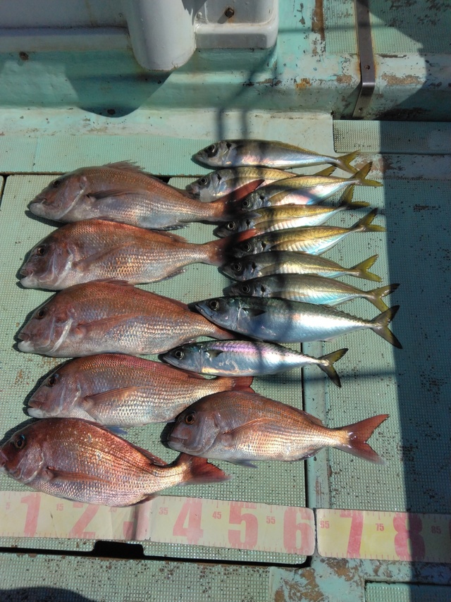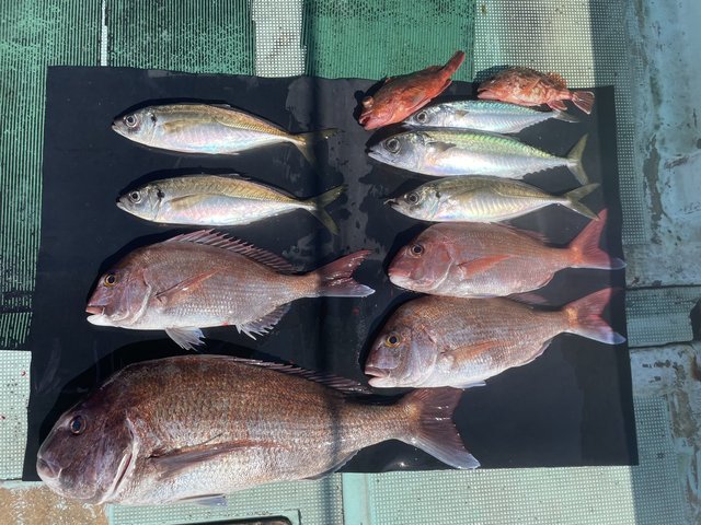0.80~2.00kg 1~8匹 アジ イナダ クロダイ イシダイ 中潮、明日も中潮。【真鯛】真鯛の大漁ヒット。トップ8枚、最大2kgの良型サイズが釣れています。高活性でお出迎えの真鯛魚群、ビギナーの方達にもアタリが連発したこともあり4-5枚ずつをゲットしていただけました。 【真鯛とアジ狙い】真鯛はみなさんがゲットで1-2枚のアタリ、最大で1.7kgの良型をゲット。中盤からはイワシのミンチを使用して、水深90mでアジ狙い。魚影は濃く、脂の乗った大型アジのヒットあり。後半の潮に入ると魚影が薄れたこともあり、前半から狙うと大型アジの連発にも期待できそうです。