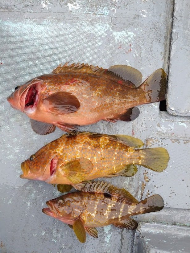 (チダイ)25~30cm 合計5匹 マダイ 43~69cm 合計10匹 チャリコ 20~38cm 合計25匹 ジガーズ2(J2)にて マダイ五目ジギング マダイ。43。50。51。53。54。54。62。64。69。69。計10枚。 チャリコ。20。~38。計25匹。 ハナダイ。25。~30。計5匹。 ヒラメ。 ホウボウ。 カナガシラ。 カサゴ。 ベラ。 イナダ。 イナワラ。 ショウサイフグ。 タチウオ。 【水温】20、8℃ 【水色】うす濁り 【コメント】久しぶりの釣行でしたが、60センチ以上の大鯛が4枚も釣れました。朝から昼までずっと風波あったお陰かも?お疲れさまでした。
