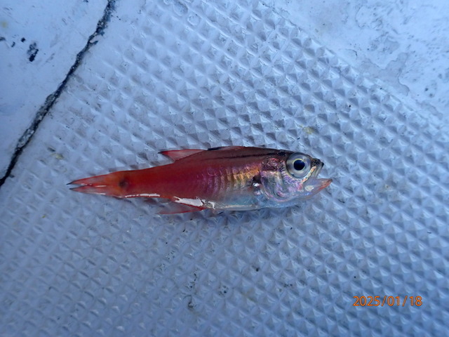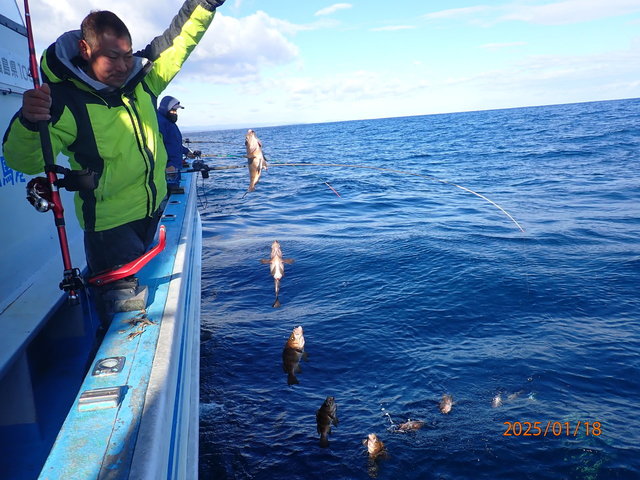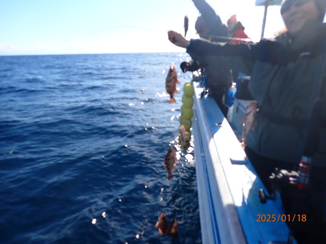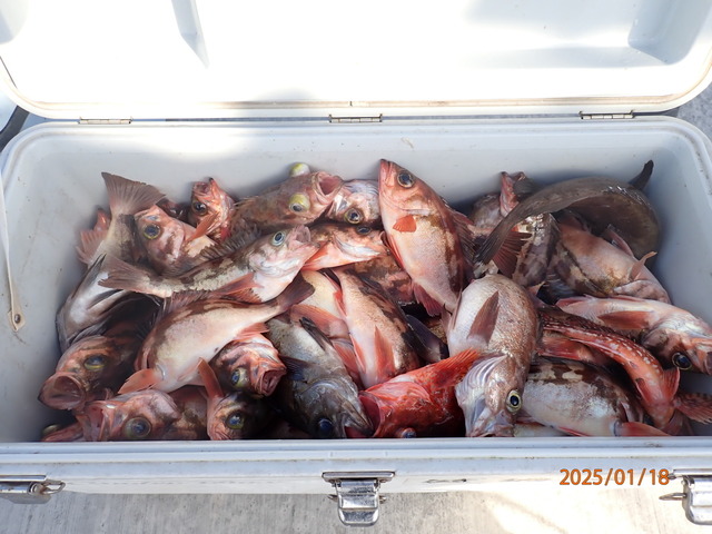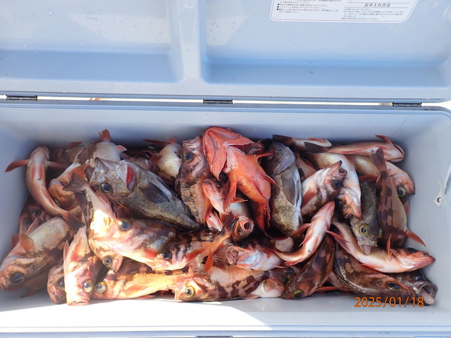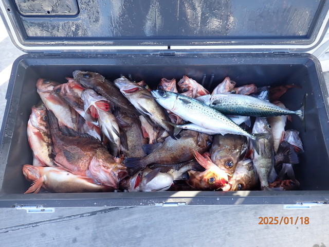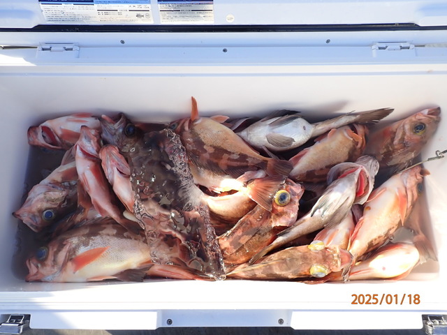 1月18日(土)豊漁丸遠征メバル五目船釣果報告 【釣果】11名乗船 ・赤黒混じりメバル20~35cm18~100匹 ・アジ30~45cm0~3匹 ・サバ40~45cm0~4匹 ・マゾイ ・ウッカリカサゴ ・黒ソイ ・ベラ ・ホウボウ ・ネンブツダイ ・水カレイ ・カサゴ 【天候】晴 【水温】12.8℃ 【水色】澄 中だるみはありましたが前半も後半もバタバタと釣れました。 メバル釣果18匹の方は針が2本の五目釣りの方です。 皆様お疲れさまでした。