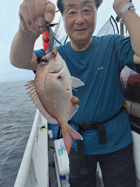 ジガーズ2(J2)にて マダイ五目ジギング マダイ。45。47。48。54。57。70。計6枚 チャリコ。25。~38。計12匹。 ハナダイ。計1匹。 アイナメ。43。 ガンゾウビラメ。 カナガシラ。 ホウボウ。 ミズカレイ。 サバ。 マゾイ。 【水温】25、5℃ 【水色】うす濁り 【コメント】大鯛に巡り合えました。お疲れさまでした。