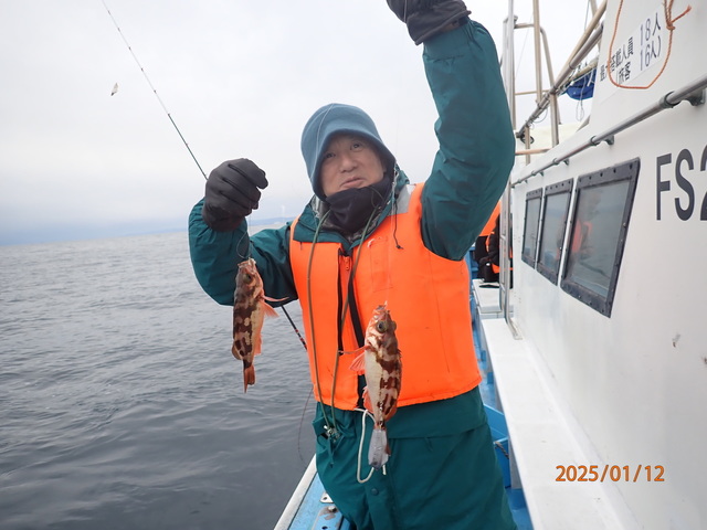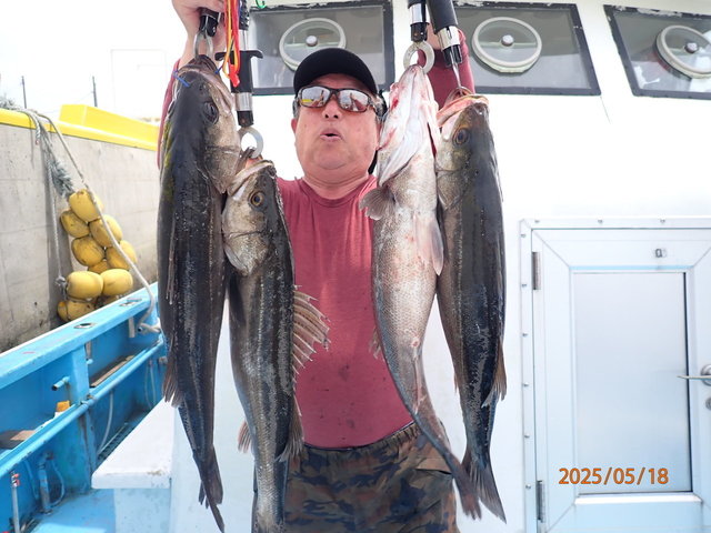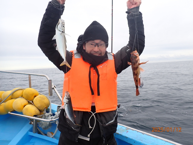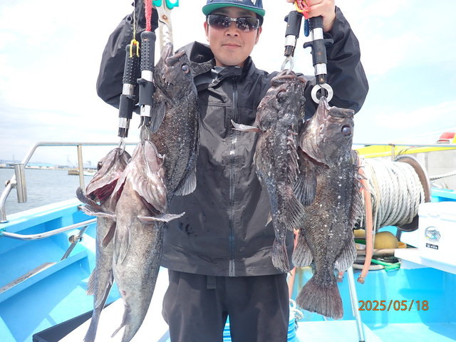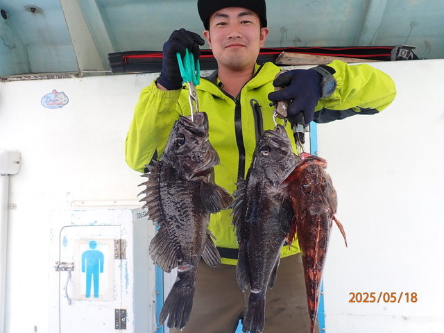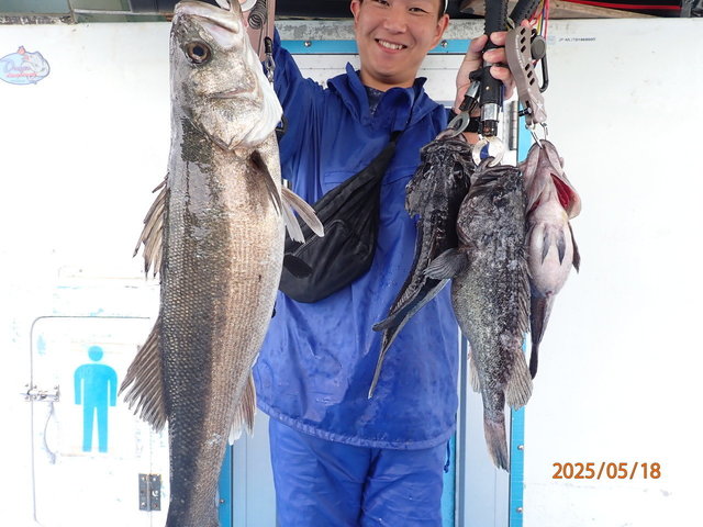 38~45cm 0~1匹 シーバス 60~76cm 0~4匹 マゾイ 40~45cm 0~1匹 クロソイ 40~53cm 4~7匹 マダイ 74cm 合計1匹 5月18日(日)豊漁丸ルアー船釣果報告 【釣果】 ・真鯛74cm(船中1匹) ・シーバス60~76cm(船中10匹) ・タケノコメバル30~35cm(船中3匹) ・マゾイ40~45cm(船中4匹) ・黒ソイ40~53cm(船中30匹以上) ・アイナメ38~45cm(船中3匹) ・ウッカリカサゴ ・ホウボウ ・サバ ・メバル 【天候】晴 【水温】14.5℃ 【水色】やや濁り 【コメント】 前半海荒らしてましたがシーバスの活性良くヒット&バラシ連発でした! シーバス初めての方も数本釣ってましたよ(^^♪ 中盤からジギングでどのポイントも根魚高活性でした。 74cmの真鯛もかかり楽しい釣りになりました。 皆様お疲れさまでした 5月23日(金)ルアー船空きあり 6月1日(日)ルアー船空きあり ~ご予約待ってます~