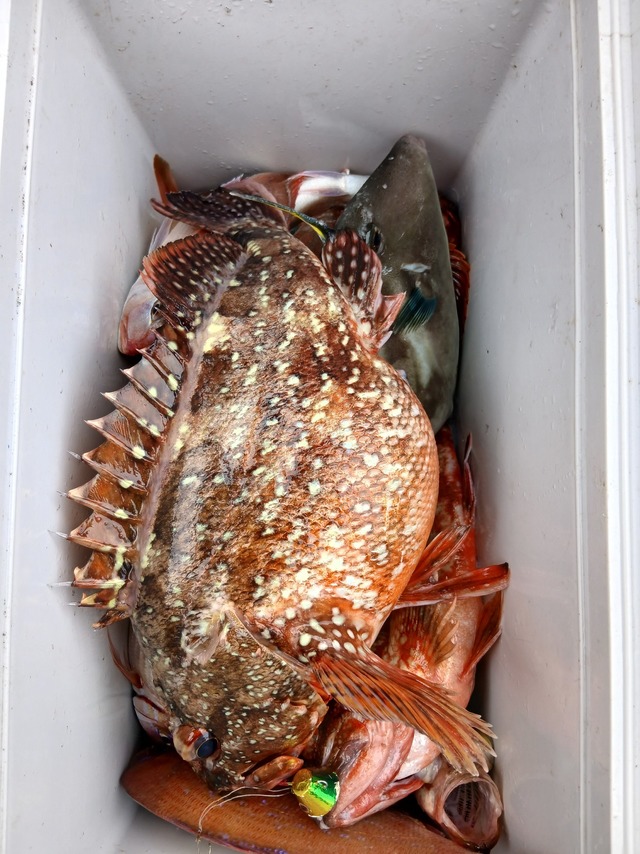 0.30~2.30kg 0~6匹 ウッカリカサゴ カサゴ ホウボウ 2、3キロ、1.6キロ、1、1キロ、1キロ・・・の真鯛浮上。明日は中止で、時化後、また出船します。平日も毎日テンヤ真鯛釣りに出船します。早めのご予約ありがたいです。