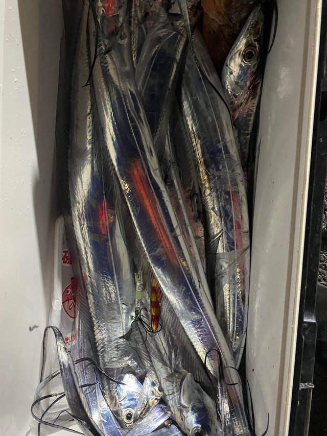 0.50kg 合計1匹 テンヤ真鯛午後船 今日はテンヤ真鯛船で出船しましたが小鯛の型が見られた程度で 途中から太刀魚の反応が出たためタチウオに切り替えました。 タチウオは5~40匹(サイズ75~110cm) 型も良く十分なお土産になりました。 明日のヒラメ船で今年は釣り納めとなります。 年明けはヒラメ船、太刀魚の反応があればタチウオ船で出船したいと思います どうぞ宜しくお願いいたします。