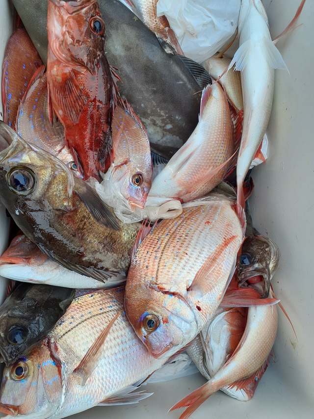 22~27cm 0~2匹 活エビ使用テンヤ五目船で出船しました。海上ウネリがあり今日は一日ポッポッと当たっていました、合わせのタイミングが合えば外道多彩に混じり数伸びました。外道メバル、ハナダイ、カサゴ、アジ、ホウボウ、ハタ、ウマズラ、カナガシラ、フグ混じりクーラー賑わいました。竿頭マダイと外道混じりで大山さん28匹、次頭金子さん、廣瀬さん.真崎さん26匹でした。8日からの活エビ使用テンヤ五目船予約お待ちしております12日だけ限定人数決まりました他の日は空席ありますので宜しくお願いいたします