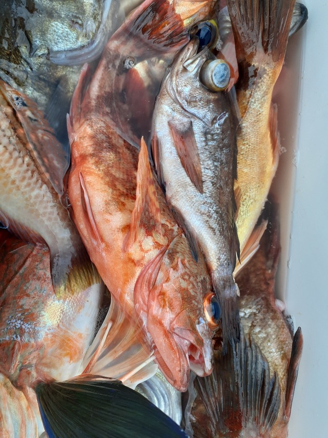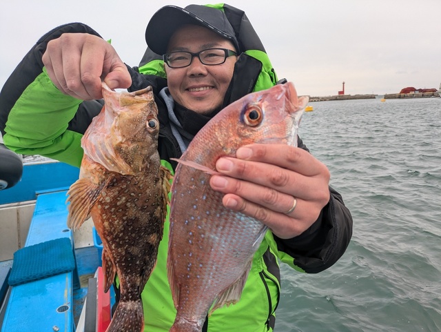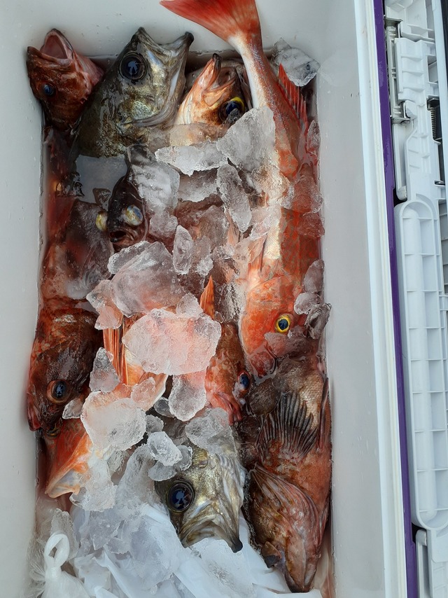 0.50~1.90kg 1~3匹 ハナダイ メバル カサゴ ショウサイフク ホウボウ カナガシラ 今日は昨日よりウネリは落ち着きましたが、濁りが増して水温が下がって冷たいです。今日はジグのお客さんで1.9kgと1.7kg良型出ました!途中、ラインブレイクが1発有りました。後半は風が増してきてポイントを変えて少し釣れましたが大鯛はお預けでしたね。