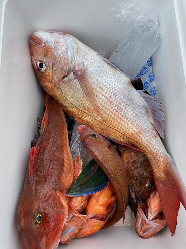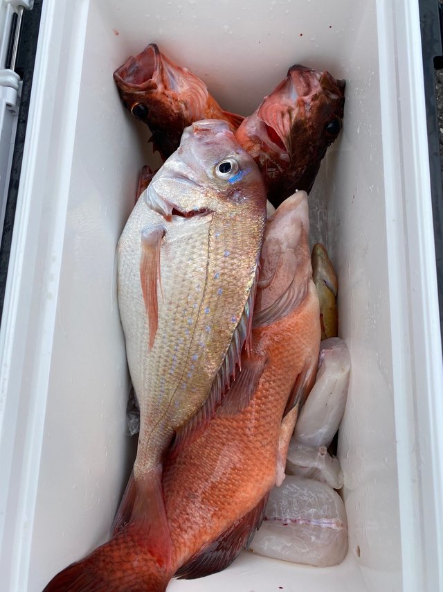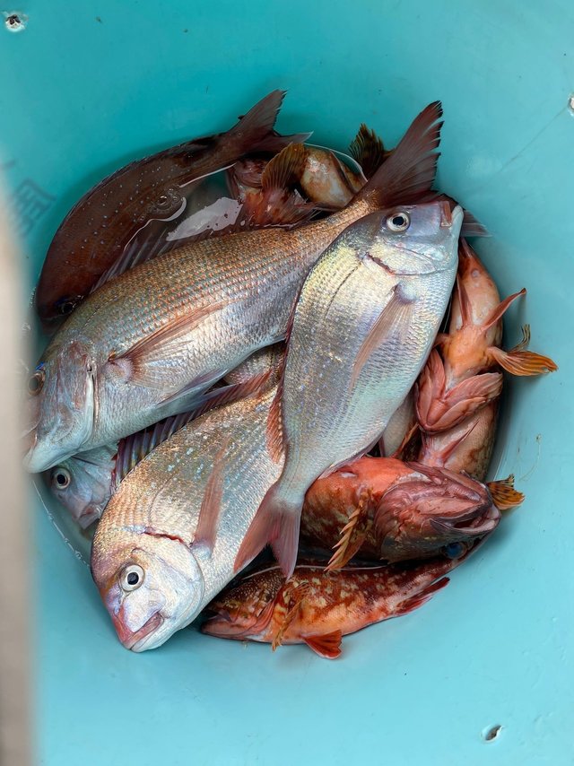 0~3匹 カサゴ メバル ホウボウ フグ テンヤマダイ船で出船しました!朝はカサゴばかりでどうなるのかと思いましたが、マコダイが1匹釣れると開戦の合図かのようにフックアウトがあり硬めの竿がかなりのしなりを見せていたので5kgオーバーだったのかなぁと思いを馳せ、その後仲間が敵討ちとばかりに2キロクラスを1匹ずつゲットしラストの流しにも1匹ずつ追加がありかなり久しぶりのテンヤ船でしたが中々の釣果でした!