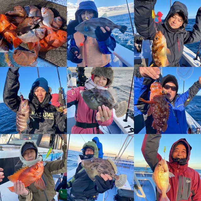 ハナダイ ホウボウ ウマヅラ カワハギ マハタ カサゴ メバル フグ マダイリリースサイズのみ。午前テンヤ・大鯛1本勝負ともに大撃沈で企画者とともにお詫び申し上げます。 今年も1年義心丸に乗船頂き誠にありがとうございました。 今年は時化が多いとこにきて釣り物の不調と良いとこ無しだったので来年は平年並みに戻って欲しいと切に願います。 毎年祈念することは不変で来年も事故怪我なく魚に恵まれる年であります様に。船頭中澤誠
