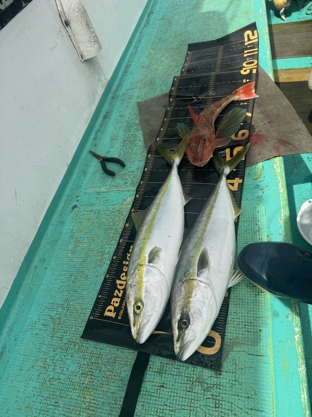 0.30~3.00kg 0~1匹 アマダイ 40~43cm 0~1匹 ウッカリカサゴ 25~40cm 0~3匹 マゾイ 28~35cm 0~1匹 メバル 28~32cm 0~2匹 ホウボウ 30~45cm 0~2匹 ワラサ 2.00~2.50kg 0~2匹 一つテンヤマダイ、タイラバで出船しました。 水温15.5℃ マダイ最大で3kgその他0.6kg、0.5kg...でした。マダイ0.3~3kg0~1尾。アマダイ40cm~43cm0~1尾。ウッカリカサゴ25~40cm0~3尾。ホウボウ30~45cm0~2尾。ゲストでアマダイ、マゾイ、メバル、カンコ、ホウボウ、ワラサ、レンコンダイ、カナガシラ、ムシガレイと多彩でお土産になりました。本日、乗船の皆様ありがとうございました。 【お知らせ】 明日4月7日(火)は一つテンヤマダイ、タイラバで出船致します。お早いご予約お待ちしております。 テンヤマダイ船集合5時になります! アマダイ、アマラバ船集合4時30分になります! ※誠に勝手ながら満船時の当日キャンセルは乗船料の100%頂きます。ご了承下さい! 一つテンヤマダイ 12,000円(エサ、氷付き) 集合5時になります。 アマダイ、アマラバ 12,000円(エサ、氷付き) 集合4時30分になります。 エギダコ 13,000円(氷付き) 集合4時になります。 ご予約 電話090-1842-0165 お気軽にお電話下さいね!!