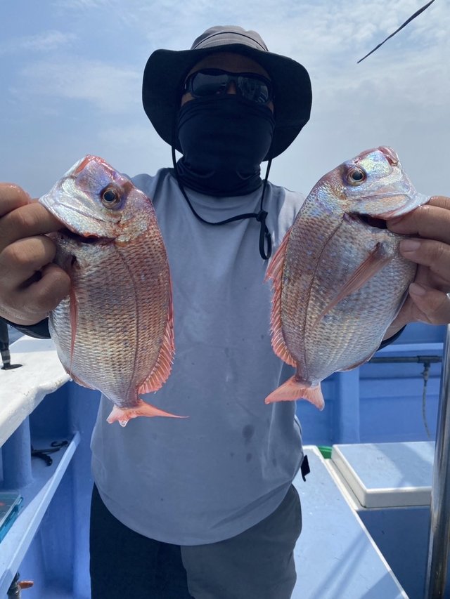 ◆ショウサイフグ船 サイズ25~40cm3~12匹 その他マダコ、トラフグ 竿頭、竹本さん ◆午前テンヤ船 1キロ代3枚、2キロ代2枚、3.13キロ、5.26キロ、6.86キロ サイズ0.9~6.86kg0~3枚 竿頭平澤さん 外道ハナダイ、ホウボウ、ショウサイフグ 今日のフグ船は潮の流れや水色が悪く数が伸びませんでした。 マダイ午前船は朝ポツポツ当たり有りましたがバラシが多く、中盤アタリ無く大苦戦でしたが昨日と、同じで残り15分前にポツポツ当たり、ラスト1分前に6.86キロヒット。やはり最後まで諦めないで頑張りましょう。 ご乗船の皆さん、暑い中大変お疲れ様でした。ありがとうございました。またのお越しをお待ちしております。