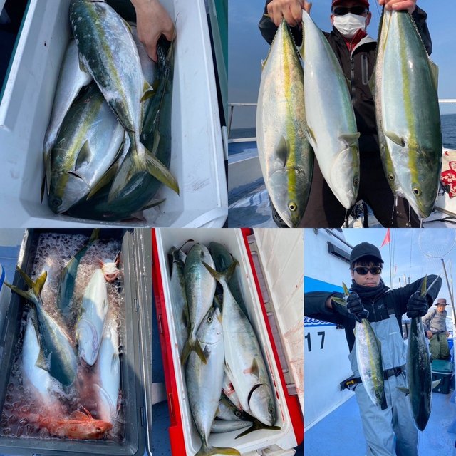 (ブリ)2.50~5.00kg 0~2匹 マダイ 0.40~1.70kg 0~1匹 今日は朝から風も目立ち時化上がりということで水色も濁り気味でマダイの活性は低い状態でした。 しかし沖のポイントで青物の活性はいいのかテンヤ、ジグどちらにもヒットしてきました! 上がった他にも切られた人もいましたね!風も増してきたので安全を考え9時早上がりとなりました。