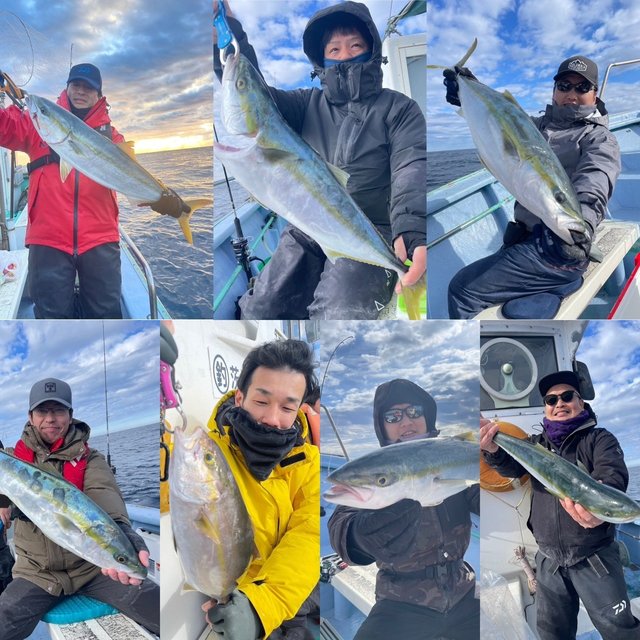 (ブリ)最小2.40kg 1匹以上 ワラサ(ブリ) 最大3.50kg 1匹以上 カンパチ 0.80~1.80kg 1~2匹 ジギング青物に数少ないが0尾無し。 さんぱく、ワラサ等、1~2尾、サイズ2,4k~3,5k。 カンパチ1~2尾、0,8~1,8k。 本年のご利用誠に有り難うございました。