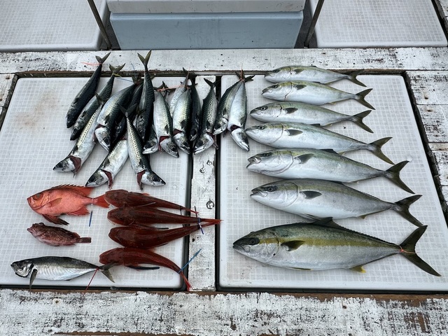 3.50kg 合計1匹 イナダ 1.00~3.50kg 0~2匹 サバ 35~40cm 2~5匹 カサゴ 26~30cm 合計2匹 カナガシラ 25~30cm 0~2匹 ホウボウ 33~45cm 0~3匹 チカメキントキ 40cm 合計1匹 アジ 38cm 合計1匹 午前ジギング船の釣果 雨の中挑戦して頂き有難うございます サバが多かったですがイナダ少しとヒラマサ1本だけキャッチ出来ました 良型大型が2バラシで残念でした 雨風強くなり少し早上がりしました サバホウボウカナガシラ結構リリースしました お疲れ様でした