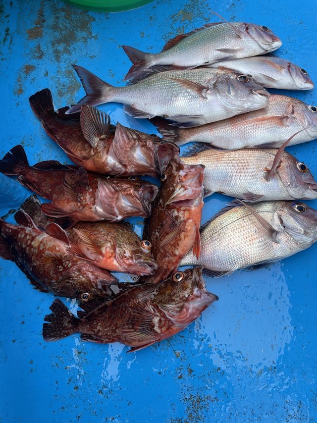 2.00kg 合計1匹 マダイ 0.30~1.00kg 1~9匹 マゾイ 28~34cm 0~1匹 カサゴ 25~32cm 0~6匹 メバル 25~30cm 0~2匹 ワラサ 2.50kg 合計1匹 一つテンヤマダイ、タイラバで出船しました。水温15.2℃ マダイ最大で1kgその他0.8kg、0.7kg...マダイ0.3~1kg1~9尾。ゲストでマゾイ、カサゴ、メバル、ヒラマサ、ワラサ、ハナダイ、ショウサイフグでした。本日、乗船の皆様ありがとうございました。 【お知らせ】 4月22日(火)は一つテンヤマダイで出船致します。お早いご予約お待ちしております。 ※一つテンヤマダイ集合4時30分に変更しました! ※誠に勝手ながら満船時の当日キャンセルは乗船料の100%頂きます。ご了承下さい! 一つテンヤマダイ 12,000円(エサ、氷、昼食付) 集合4時30分になります。 アマダイ、アマラバ 12,000円(エサ、氷、昼食付) 集合5時になります。 エギダコ 13,000円(氷、昼食付) 集合4時になります。 ご予約 電話090-1842-0165 お気軽にお電話下さいね!!