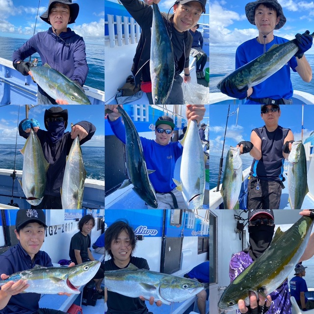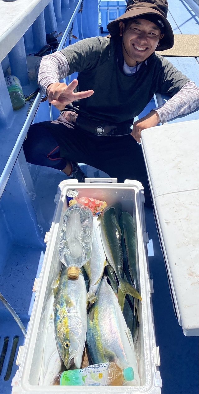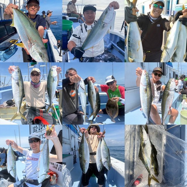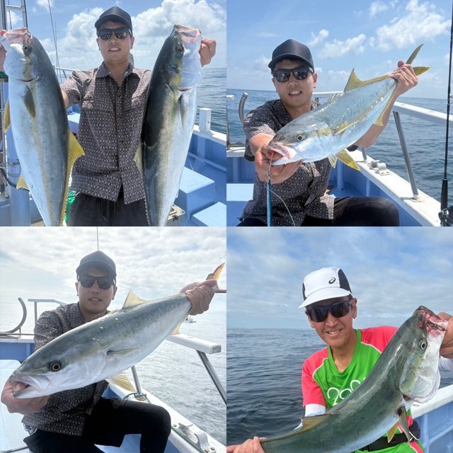 1.00kg 合計1匹 ワラサ 3.60~4.50kg 0~3匹 カンパチ 1.00~1.80kg 0~1匹 イナダ 1.00~2.50kg 3~18匹 ☆☆青物ルアー船☆☆ ワラサ0~3本3.6~4.5キロ ヒラマサ0~1本1.キロ カンパチ0~1本1~1.8キロ イナダ3~18本 他、ワカシ、カサゴ 朝からポツポツとあきない程度にヒットし良い感じに 昨日もそうでしたがイマイチサイズが!中にはワラサもいるのですが先にイナダの方が食いしん坊みたいですね。 スソは船酔い 海上も暑いので水分補給はマメにして下さい。 飲み物も少し大目に持ってきた方が良いかと! ルアー船は踵のあるサンダルでお願いします。