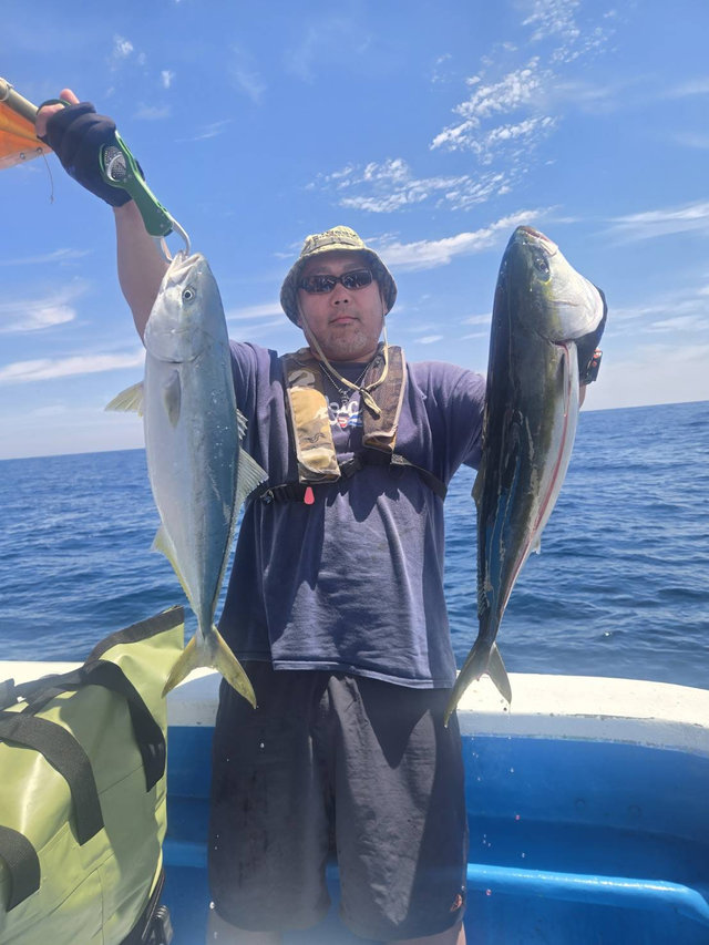 1.80~2.80kg 0~3匹 ワラサ 4.00~4.90kg 0~6匹 カンパチ 1.10~3.10kg 0~1匹 ルアー ☆☆青物ルアー船☆☆ ヒラマサ0~3本1.8~2.8キロ ワラサ0~6本4~4.9キロ カンパチ0~1尾1.1~3.1キロ 他、イナダ 朝イチ高反応からのヒット&キャッチで良い感じでのスタート?? 若干魚の移動が速く感じましたが、まだ想定内でした。 青物はまだ楽しめそうですよ! 海上も暑いので水分補給はマメにして下さい。 飲み物も少し大目に持ってきた方が良いかと! キャスティングタックルを準備してください。 ルアー船はサンダル、魚サンは禁止にします。踵のあるサンダルは大丈夫です。