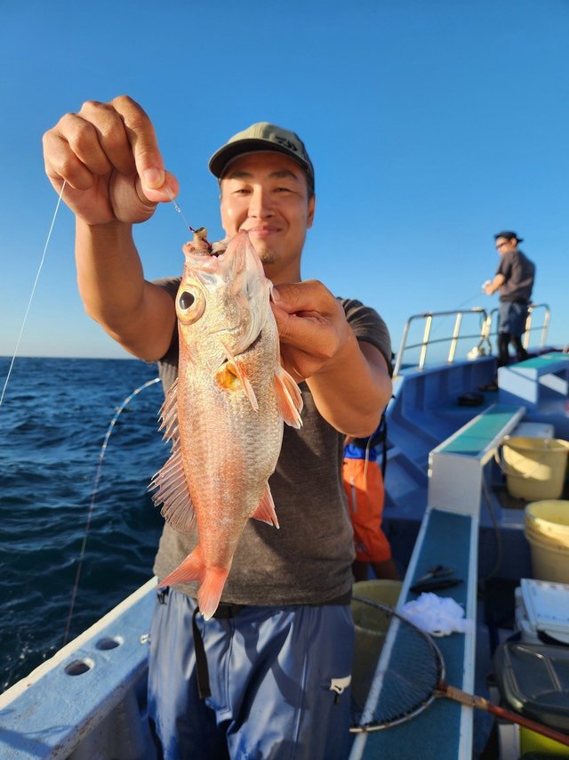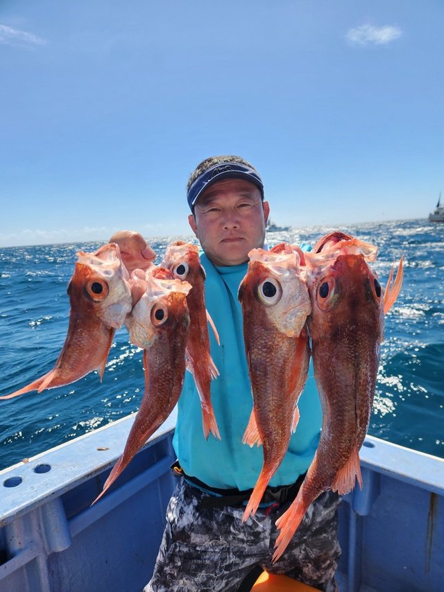 アカムツ 25~38cm 3~8匹 ムシガレイ オキメバル アジ カンコ アマダイ アカムツ釣り。前半サバ多く潮流れず、後半アタリ多く規定数3名と好調に釣れました。