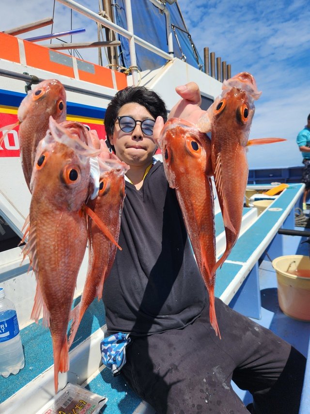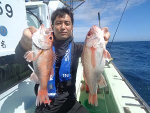 75~80cm 0~2匹 アカムツ 20~30cm 1~8匹 カツオ 2.80kg 合計1匹 ムシガレイ 15~25cm 0~1匹 ドンコ 20~25cm 0~2匹 アカムツ船 カンネコ根のポイント 水深、120m前後を狙い 今日は食い良く ポロポロ掛かりましたよ~(^o^)/ ボウズなく終われ よかったで~す! 本日、8本ゲット、2名! 「小用様」「草間様」 おめでとうございま~す! 平均、3、4匹でしたよ(*^^*) うねりの中、お疲れさまでした!