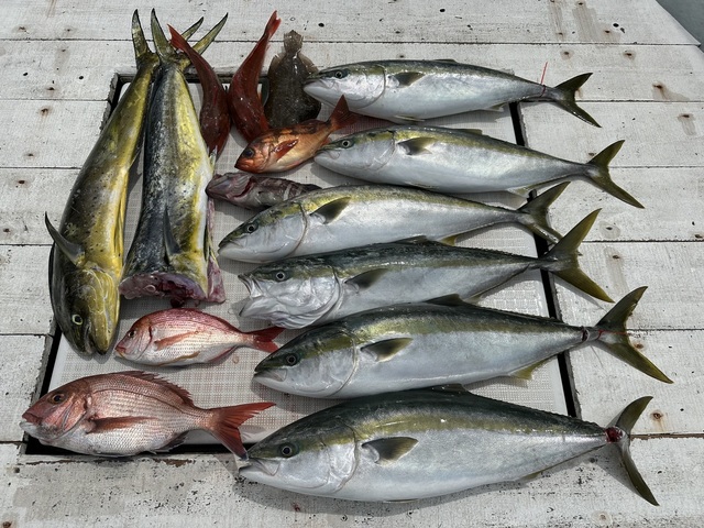 50~80cm 1~8匹 イナダ 2.00kg 合計1匹 ワカシ 20cm 合計1匹 トラフグ 40~52cm 0~2匹 ホウボウ 35~45cm 0~2匹 カサゴ 20~33cm 0~2匹 ヒラメ 0.30~1.10kg 0~1匹 ジギング船の釣果 序盤で鳥山見つけて突撃しましたがシイラ祭り開催! 青物はイナダ1キャッチのみで無限シイラ地獄でした シイラはオールリリース! 小さい魚もリリース! 青物はかなり厳しく頑張って頂きましたが大変お疲れ様でした