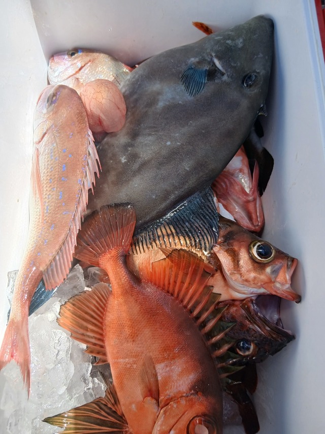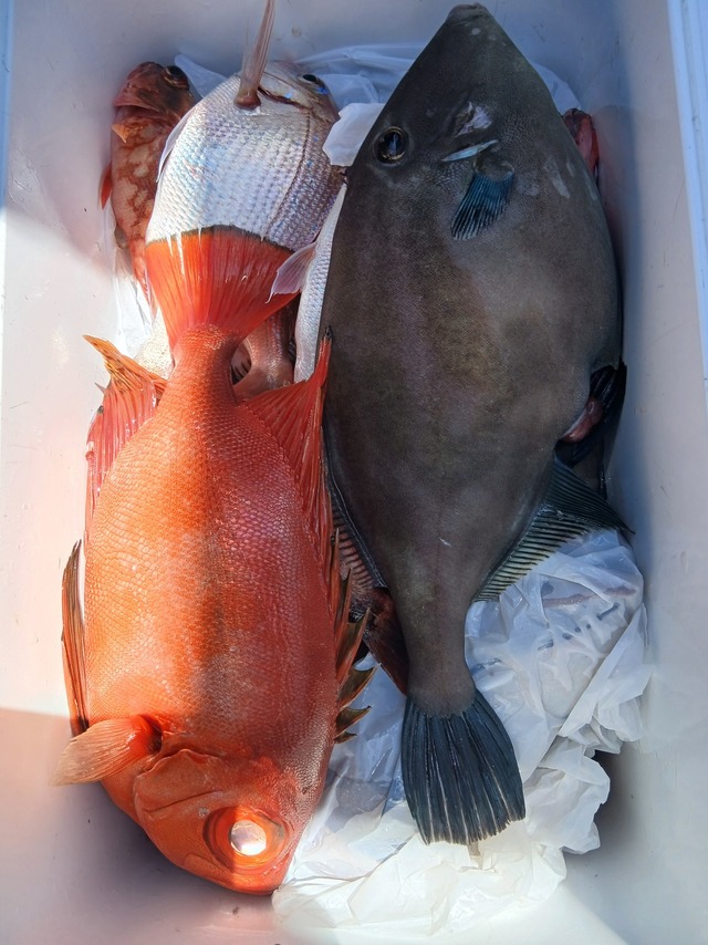 (チダイ)21~30cm 1~14匹 マダイ 22~65cm 0~2匹 本日マダイ5.5kg秋元さんゲット、船先でテンヤのみで釣りましたタイの反応あるが食い渋り反応の高さ8m位あるので反応の所を巻きなが探って下さい。外道は多彩でカサゴ、ハタ、ウマズラ、メバル、カンダイ、キントキ混じりました。色とりどりでクーラー賑わいました。竿頭植田さん初竿頭マダイと外道混じりで30匹、次頭岡田さん26匹、本沢さん26匹、3番手伊藤さん25匹でした。、ハナダイ数か少ない方は合わせに問題ありさおは真上まで上げないと掛かりませんよ。今日もエビ取りに行きますので17時までに電話の方はお願いいたします。17日1席空席あります予約お待ちしております。