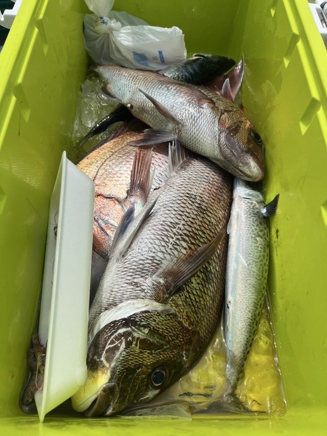 (チダイ)25~35cm 0~5匹 マダイ 0.50~3.90kg 0~6匹 内訳)3.9kg・3.1kg・3.0kg・2.8kg・2.0kg・1.7kg・1.6kg・1.6kg・1.5kg・1.5kg・1.5kg・1.4kg・1.4kg・1.3kg・1.3kg・1.3kg・1.2kg・1.2kg・1.2kg・1.1kg・1.1kg・1.0kg・1.0kg・1.0kg 今日は一日潮流れずもアタリもポツポツとありマダイも上がれば良型で誘いの合う人は枚数も取れました!ハナダイ、ホウボウなどのゲストも上がりお土産にになりました♪ 大鯛のバラシ、すっぽ抜け何回かありました!大鯛チャレンジもまだ枠残ってます!今後も期待できそうです!!