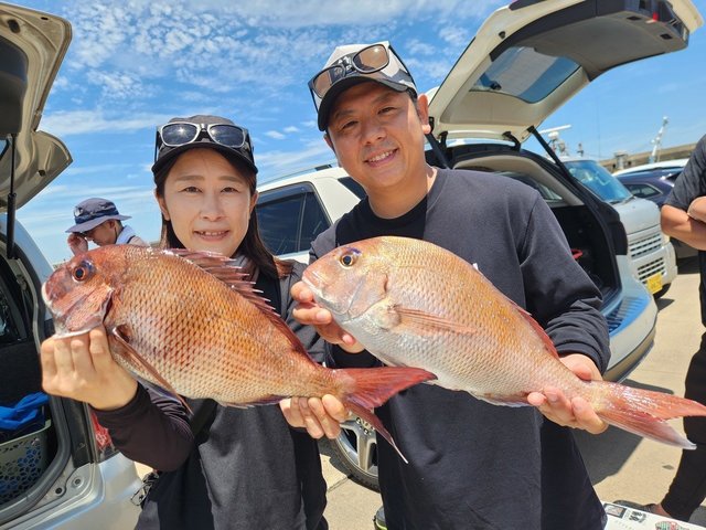 (チダイ)0.40~0.80kg 0~6匹 マダイ 1.00~2.20kg 0~2匹 ホウボウ 35~45cm 0~2匹 トラフグ 0.50~1.50kg 0~1匹 カサゴ 15~25cm 0~5匹 午前テンヤ真鯛船 (2隻の高低差) 北のポイントを狙い 真鯛、ハナダイ ポツポツでしたがあがりましたよ 1キロ 1、1キロ 1、5キロ 2、0キロ 2、2キロ 他にも、外道が掛かりましたが 今日は、厳しかったですね… 暑い中、お疲れさまでした!