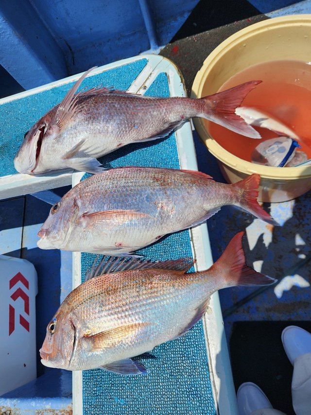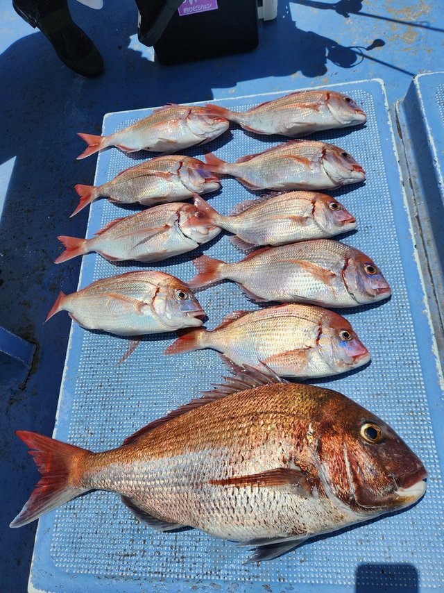 (チダイ)2~10匹 マダイ 0.40~3.30kg 0~6匹 朝から喰い始め、 3.3キロ•2.8キロ•2.2キロ•2.0キロ•2.0キロ•1.7キロ•1.7キロ•1.5キロの型物を筆頭に喰いました。他にも大鯛2発チャンスありましたが…痛恨のラインブレイクとバラシで残念でした。 型物連発でした。 今日はアタリ多く好調でした〜。 お乗り頂いたお客様お疲れ様でした。 ※活き海老開始しました。 自然相手ですので…ない場合は冷凍海老になりますのでご了承ください。 数に限りがありますので、基本的に2匹掛けは厳禁で。ご協力お願いします。