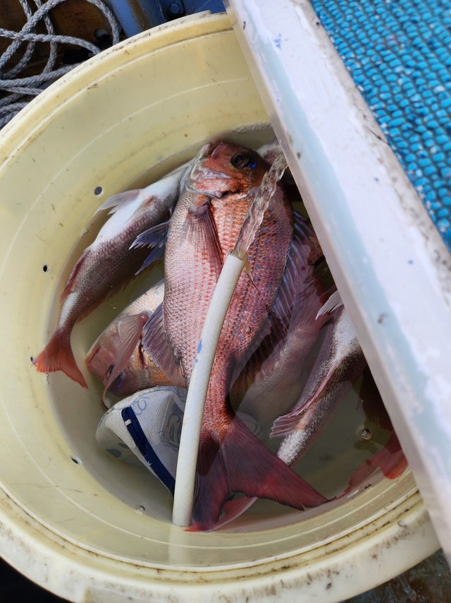 (チダイ)0.30~0.50kg 11~13匹 マダイ 0.30~0.60kg 1~3匹 水深25m 活エビ使用でアタリ多く好調! 大鯛は不発でしたが、外道豊富でお土産になりました!