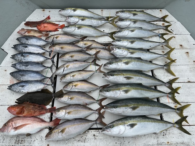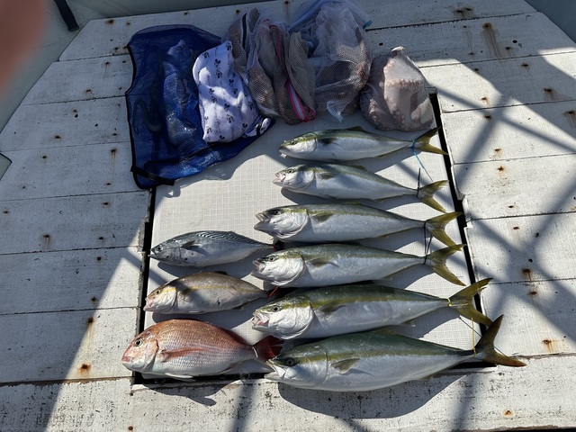 (スマ)2.00kg 合計1匹 イナダ 1.50~3.00kg 0~3匹 マダイ 1.80kg 合計1匹 ショゴ 1.40kg 合計1匹 トラフグ 1.00~2.00kg 合計2匹 マダコ 0.30~2.20kg 0~5匹 マダコリレー船の釣果 朝からウネリ有り少し釣りにくい日でした マダコは喰い浅くけっこう巻き上げ中に落ちてしまいました その後約2時間はジギングしました 風波強い中お疲れ様でした