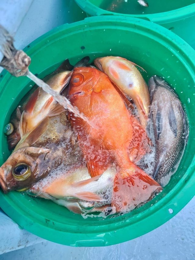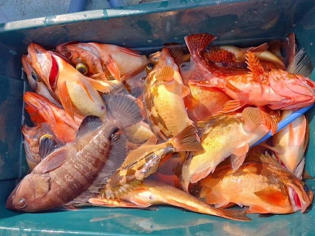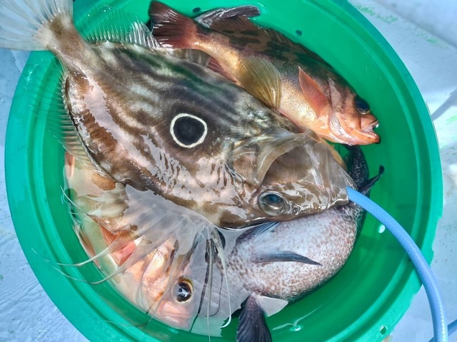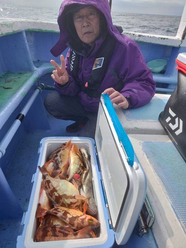 (マハタ)メバル カサゴ ホウボウ 大きい方の船でメバル五目釣り。 メバル五目釣りはメバル、カサゴ、ハタ、ホウボウ、など6~30匹。 腹パンの良型メバルが多く釣れ、多点掛けは7点掛けが最高でした。カサゴも良く混じりました。