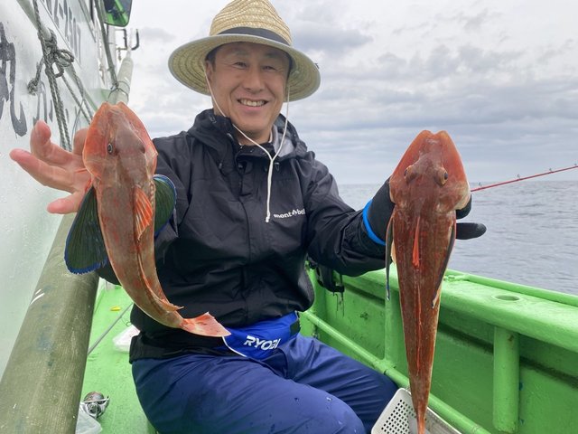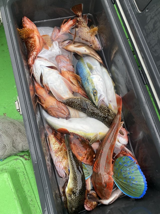 ホウボウ ハタ ソイ アカメバル クロメバル キントキ ワラサ イナダ オキメバル 風向:南西。 潮:大潮。 波高:2.5。 根魚五目船。 沖を攻めてきました。 水深40~45m。 本日の魚種も多彩です!! ホウボウ・ハタ・ソイ・赤・黒メバル・キントキ ワラサ・イナダと皆さんお土産十分出来ました。