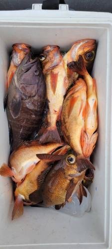 (ユメカサゴ)20~35cm 5~13匹 マハタ クロメバル ワラサ ムシガレイ 浅場根魚五目船です。海上ナギ良く、魚種多彩で土産になりました。