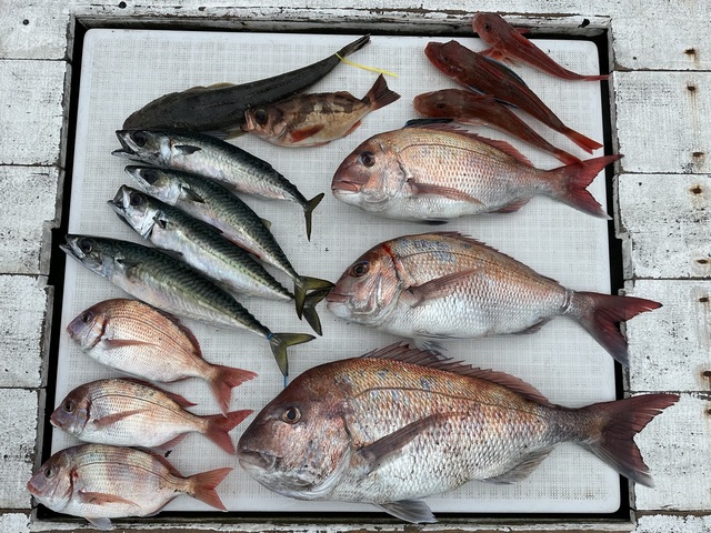 マダイ 0.60~1.00kg ハナダイ ホウボウ カサゴ ガンゾウ フグ 今週は雨の日もありますが14日(土)までは凪予報なのでお待ちしています。