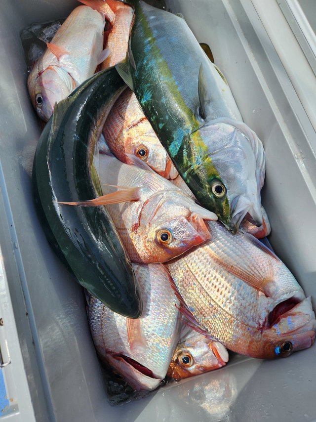 午前テンヤ真鯛船 (2隻の高低差) 北のポイントを狙い、 今日は、潮流れてなく、 巻きものの方が、 真鯛掛かりましたよ~(^o^)/ 4、7キロ 3、7キロ 2、5キロ 2、2キロ 2キロ 1、8キロ 1、7キロ 1、7キロ 1、6キロ 1、5キロ 1、5キロ 1、2キロ。 おめでとうございま~す! 活き餌の方は、ハナダイが多数でしたね! お疲れさまでした!