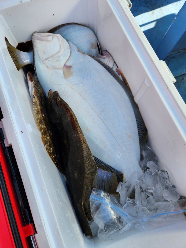 (ガンゾウビラメ)ヒラメ 0.50~2.00kg 0~4匹 ハタ カサゴ キントキ 本日は中盤からポツポツ掛かりました。明日もヒラメ船に出船します。ご予約受付中です。