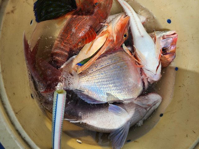 (ガンゾウビラメ)30cm 合計1匹 マダイ 1.20kg 合計1匹 ハナダイ 0.50~0.90kg 2~10匹 ホウボウ 30~40cm 0~3匹 カナガシラ 15~25cm 0~2匹 マゴチ 45cm 合計1匹 イナダ 40cm 合計1匹 午前テンヤ真鯛船 北のポイントを狙いましたが 今日は、潮流れ悪く 当たり少なく苦戦。 ハナダイは、ポロポロ掛かりましたが 真鯛は、1匹しか見られませんでした、、