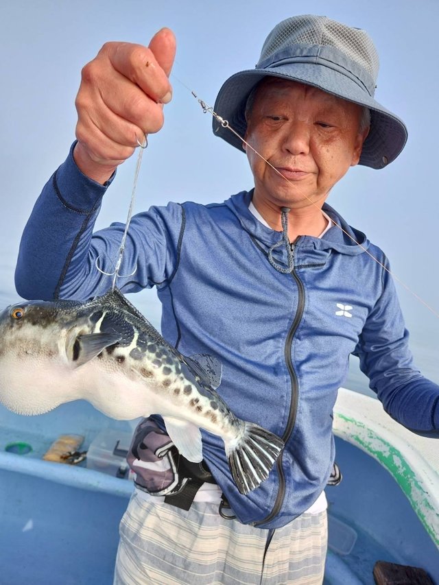 25~45cm 6~14匹 ショウサイフグ25~45cm…6~14匹。 他マダコ、カワハギ、ムシガレイ。 前日の終盤に好調だった浅いジャリ場から始めましたが、本日は型が出ず(-_-;)。反応は有るのでしばらく粘って見ましたが、型を見るだけでした。 その後あちこち探しまわり、9:30頃にやっとフグが口を使ってくれる場所を見つけました。 上の潮だけが速くて、下潮は全く動いていない状況でしたが、定刻までポツリポツリとフグはマダコやカワハギ混じりで型を出し続けてくれたので、土産は何とかなりました。 毎日状況が変わるので連日苦戦続きですが、今日も探し当てました(笑)。