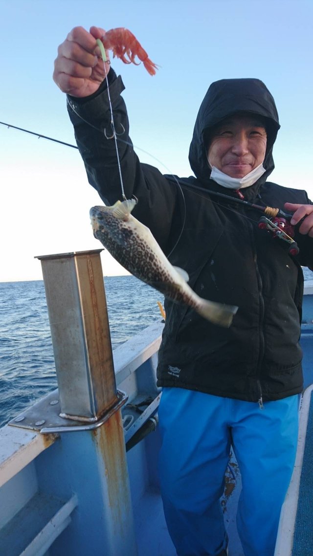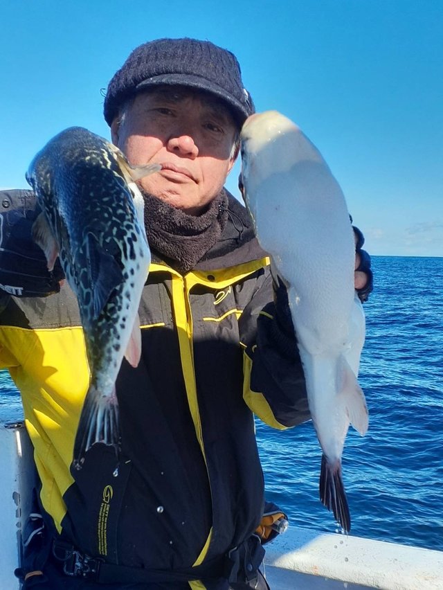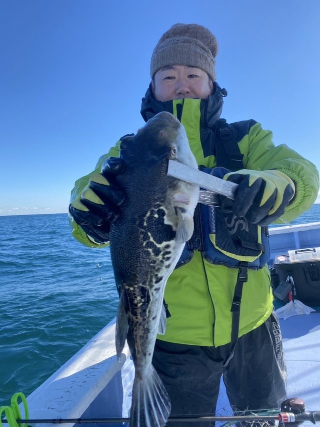 45cm 合計1匹 トラフグ 2.00kg 合計1匹 フグ ショウサイフグ25~45cm…2~9匹。 他トラフグ2kg、マダコ1~2.5kg…船中3ハイ、ホウボウ、カワハギ、ムシガレイ。 潮が動かず苦戦しました。 前日好調に釣れた砂底のポイントも型を見ただけでした(涙)。 中盤以降に根の中やジャリ場に狙い場を変えてからやっと型が出る様になりました。 今日も終了間近にアタリ多いポイントに当たり、最後15分で5匹釣った人もいました(-_-;)。 フグはいるんですが毎日付き場が変わり、本当に難しいですね(涙)。 また頑張って探します。