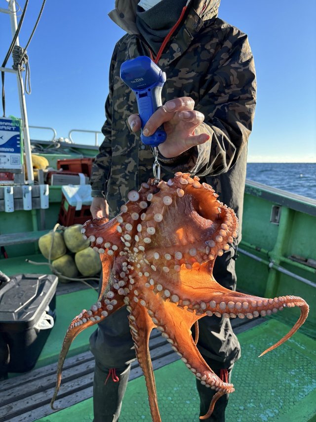 0.50~2.70kg 0~9匹 マダコ ◎●○マダコ船○●◎ マダコ0.5~2.7kg 0~9杯 今日はなぜか大ダコには出逢えませんでしたが、小型が多い訳でもなく、2kg前後の良型主体。最初と最後にプチラッシュタイムあって、オデコはあとお1人…というところまで行ったのですが…、残念! それ以外の時間帯もポツリ、ポツリと釣り上げていたトップの方や2番手7杯の方、他上位陣は型も良型揃いで重量感ありましたね! 竿は硬め(強め)のものが良いでしょう。 オモリは六角(小田原)オモリの40、60、80号を潮流等により使い分け!蛍光や派手なカラーリングは不要です。
