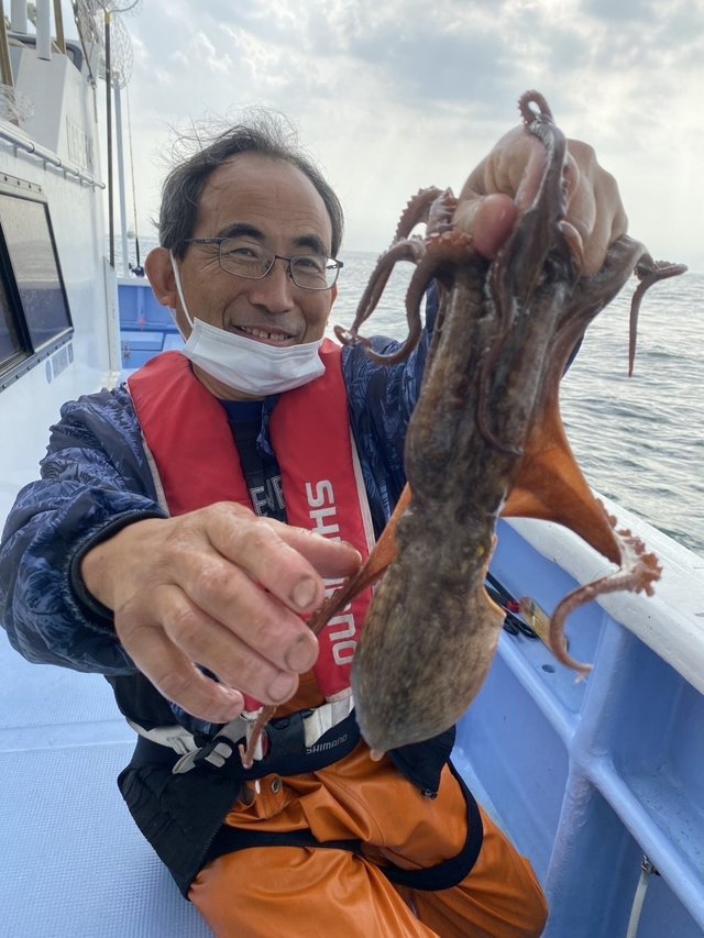 マダコ船で出船しましたが水温低下、底荒れもありマダコ乗り悪かったです、マダコが乗ったら5秒から10秒位数えからしっかり合わせてから巻き上げて下さい。竿頭菊池さん6杯でした。明日は天候不順のため休みになります。船上はまだまだ肌寒日がありますので一枚多めに着て下さい