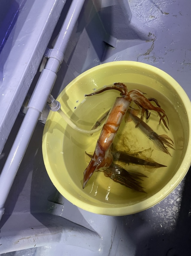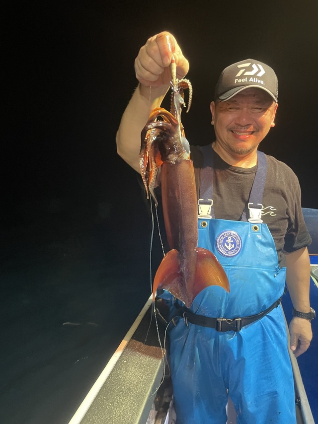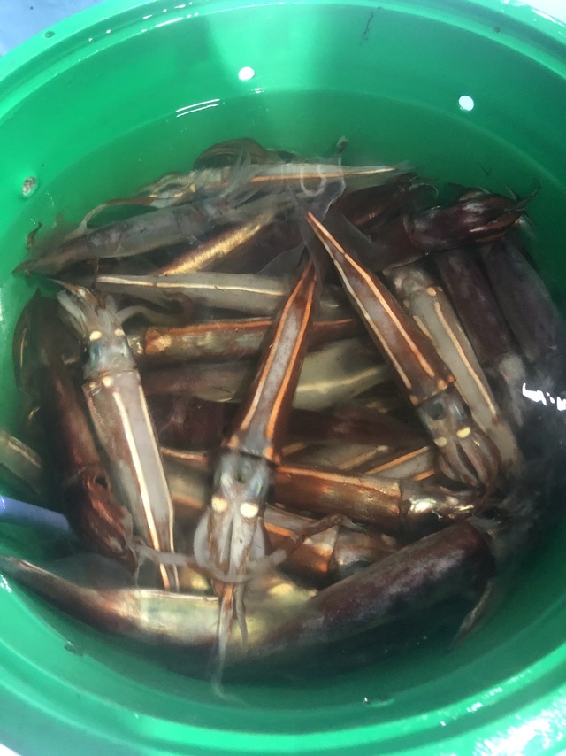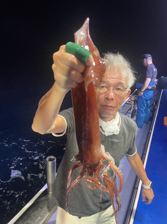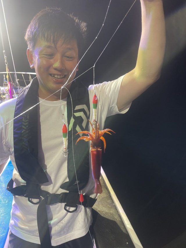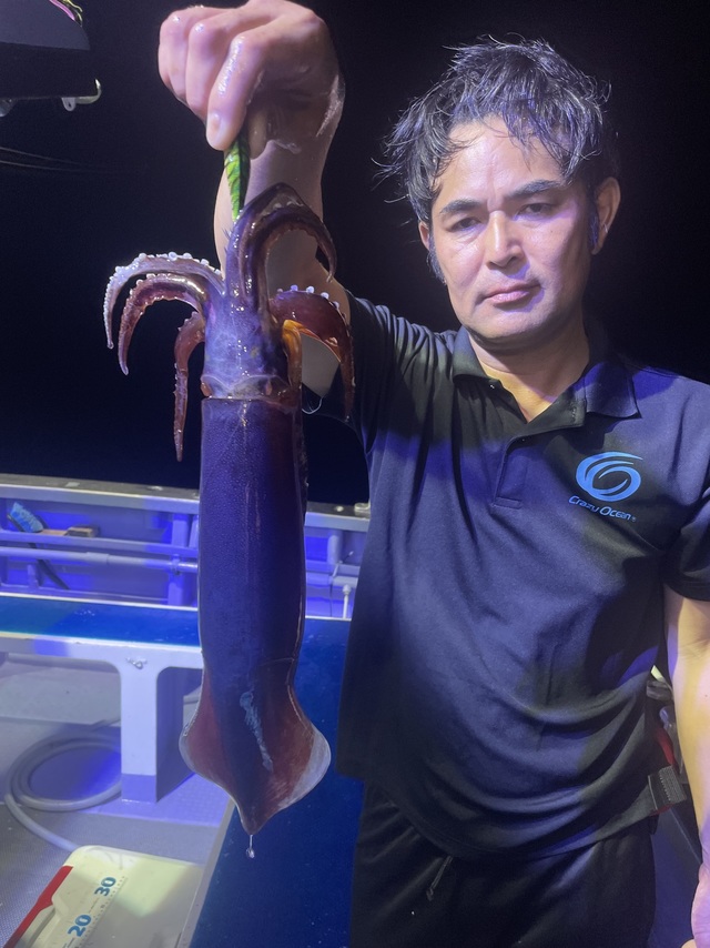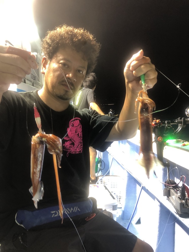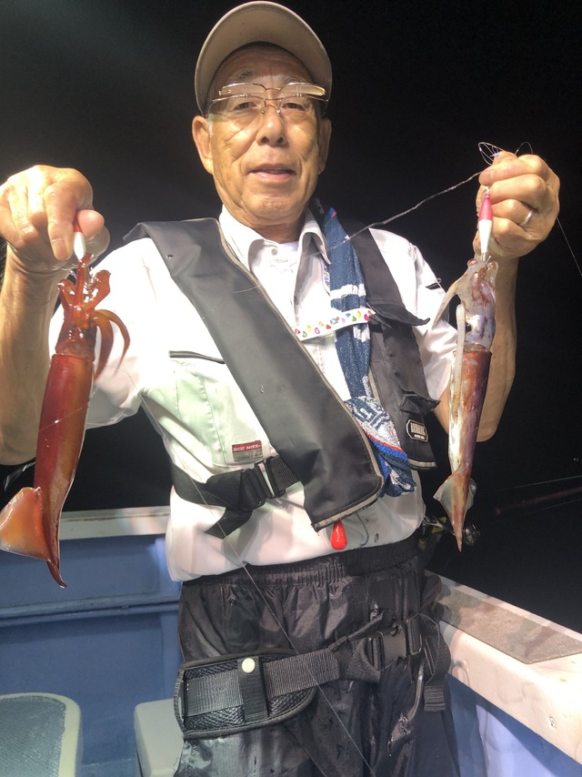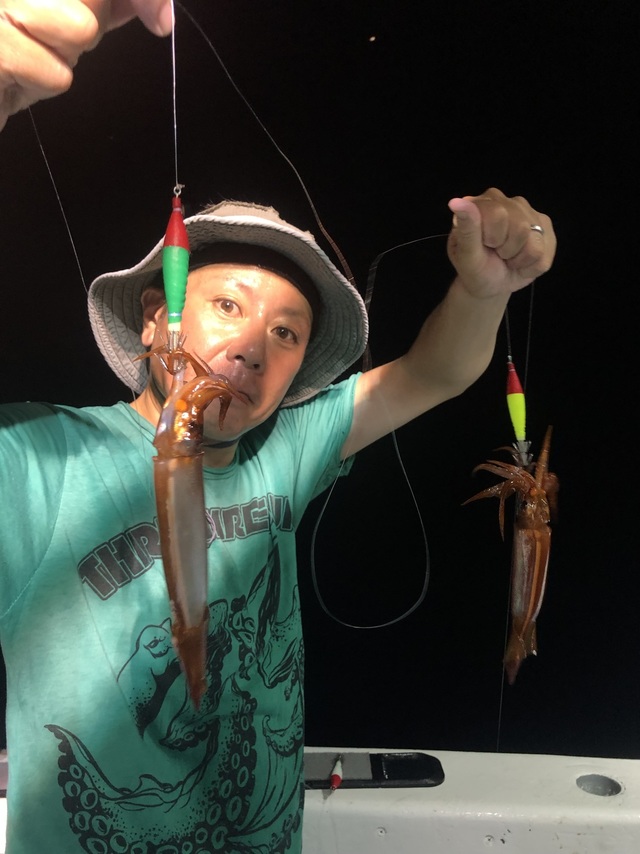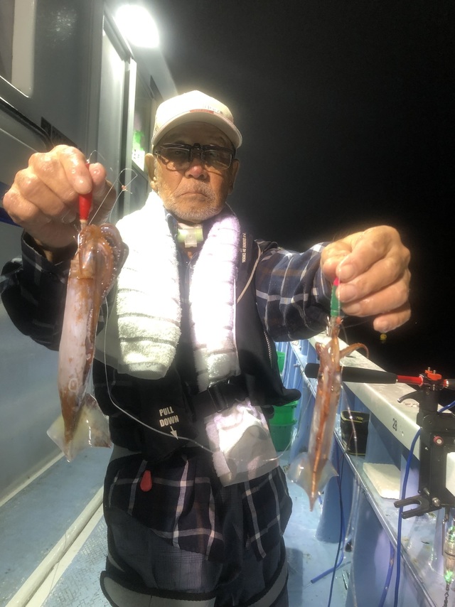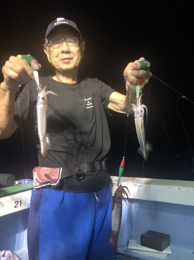 25~40cm 50~215匹 ムラサキイカ 35~45cm 0~5匹 今期最高の食いでした! ほとんどの方が100匹超えました! 最初1投目から何匹も針に食ってきました それが最後まで続きました 棚30~40mと浅いです 200匹超えた方が2名 船に初めての方も100匹超えました 最低釣果は船酔い者 寝てしまったので 途中から南風が強く吹き 波が高くなってきたので 21:30に早めに帰港しました それでもこんなに沢山釣れましたよ!