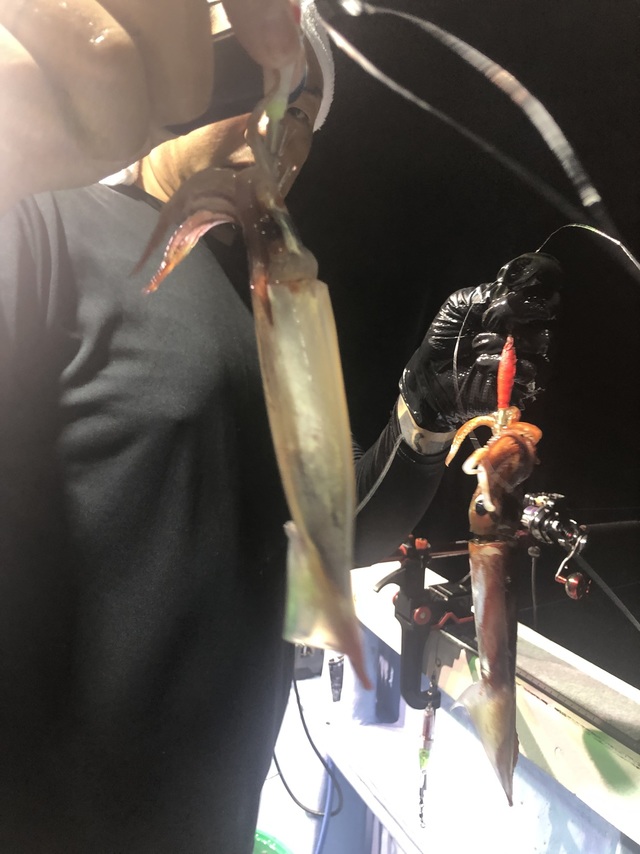 23~40cm 25~235匹 ムラサキイカ 40~47cm 0~5匹 最初から最後まで落とす度に何匹も針掛かりしてきて入れ食いが最後まで続きました ものすごい食いになっています イカ釣り初めての方も3本針で 131匹釣りました 釣れない方のタックルは 水中ライトがLEDではなく昭和の豆電球や LEDでも暗い灯り 点滅しないライト レインボーに光るライトは当たりが少なかったです 波長が長い青色、緑色が効果的面 黄色や赤色は波長が短いので光が届かないです あとは釣れる仕掛けでやらないと全く食いません 明日も出ます 日曜日はマルイカ狙いで出ます 参加者募集中です