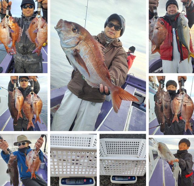 0.30~1.30kg 0~17匹 明日はヒラメとテンヤマダイ 午後テンヤマダイとアイナメ五目(どちらもガラガラ)で出船予定です! 年末年始のご予約はお早めに! 31日午前船まで出船致します。 年始は都合により3日(金)からアカムツとヒラメで出船致します! 集合時間 3日(金)ヒラメ4時15分アカムツ3時30分 年明けからはヒラメとアカムツ、午後テンヤマダイ又はアイナメ五目で出船予定です!ヤリイカは様子を見て募集致します!(伊勢海老、カワハギ、ウマズラ、カサゴ、メバル、カンダイ混) 1月3日(金)からはヒラメとアカムツ、午後テンヤマダイ 本日も潮流れ悪くヒラメはイマイチ…。 竿を落としてしまった方が居て大船長が落としたポイントにもう一度行ってみて皆さん、どなたかいつもと違うアタリがあれば…と、一発で釣りあげて下さった方がいて、しかもスズキが釣れたというミラクルが…。落とした方も大喜びな出来事でした(ノ・∀・)ノ マダイはゲスト混じりでお土産となりました。 12月からヒラメの集合時間が4時、沖根魚が3時15分に変更となります。 餌の都合上、ご予約は前日までにお願い致します。 初めての方や慣れていない方は是非、船長の見える場所へお座り下さい! 予約時すぐに電話に出れない時がありますが折り返します! 人数集まれば出船致します。 人数が集まらないと出船できません。 人数と釣果次第で変更します。 千葉東金横芝ICから匝瑳市(旭市隣)まで高速道路が延長になりました。最終、匝瑳ICで降りて右折、海沿いで是非いらっしゃって下さい。早くなりますよ~! 天候の変わりやすい季節です。 変更あればこちらでお知らせ致します。 前日前々日にご確認のご連絡下さい! 今後はヒラメ、沖根魚(アラ、鬼カサゴ)、テンヤマダイ、アマダイ、アジハナダイ&イサキ五目(コマセ) 午後テンヤマダイ、カサゴ五目 午前船のお客様はお弁当付いてます(ノ・∀・)ノ 集合時間 ヒラメ4時 アカムツ、沖根魚3時15分 アマダイ3時15分 マダイ、アジハナダイ&イサキ五目4時 時間厳守でお願いいたします! もし遅れる等の場合は早急にご連絡下さい。他のお客様を待たせてしまう、出船時間も遅れてしまいます。 リクエスト、人数天候等により変更あります! テンヤは遊動式しかけで!初心者でも釣れますよ~! 初心者の方、予約時お知らせ下さい。 救命胴衣(無料)、レンタル貸竿(基本無料。有料も有)ございます。