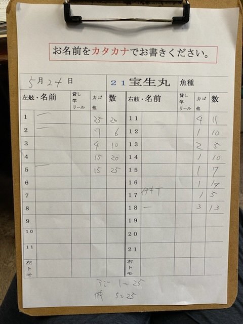 27~36cm 5~33匹 アジ 25~38cm 2~12匹 【午前アジ・イサキ船】 前半は潮が速くて大変でしたが、 その後、海が落ち着き皆さまがお土産を確保できました! 明日は天候不良により休船となります。 26日以降のご予約お待ちしております。 マダイ、アジ・イサキ船で出船、午後船、又は仕立て貸切船もご相談ください。 本日もありがとうございました!