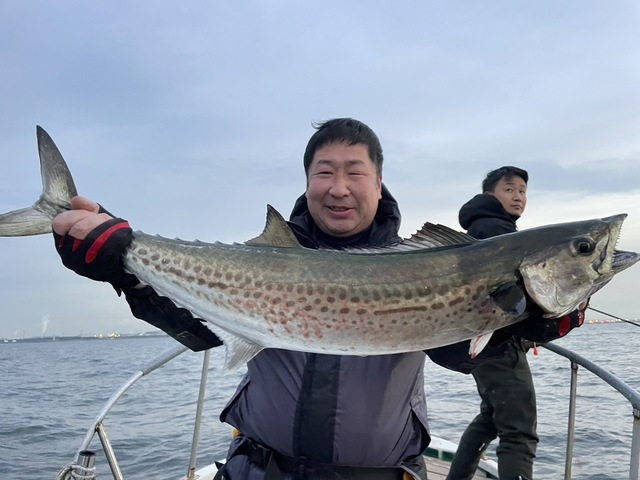(スズキ)サワラ 3.40kg 朝から北風強いですね。 無理しないで風裏限定で粘ってみました。 反応はモリモリで即引っかかってきたのはコノシロ連発。 サワラ付いてるかな〜と暫く探ってみたけど、引っかかってくるのはコノシロOnly。 ポイント変えてカタクチイワシの反応にしつこく流してると待望のヒット。 風下側のアングラーさんにヒットしたので船下へ潜り込まれましたが、上手くコントロールされて1本目をキャッチ。 続いても同じ方にホール中にヒット。何か引きが違うぞ⁇ と言う事でしたが良型シーバスでした。 その後も探索しながら探って貰いましたが、残念ながらお時間となりました。
