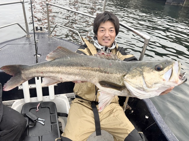 (スズキ)50~88cm 合計13匹 午後シーバス2号艇石井ちゃん 午後はまだ風が残っていたため、まずは風裏のポイントからスタート。 こちらはベイトがしっかり入っており、早々にトップやジョイント系ルアーに好反応! バラシは多かったものの、しっかりキャッチもできて良い流れ。 その後はサイズ狙いで午前に良かったポイントへ移動。 ここで出た1本がなんとランカー! 見事な秋らしい魚体に一同テンションアップ! 後半はランガンスタイルで各所をチェックするも、潮のタイミングが合わず苦戦。 それでも、前半に入ったポイントへ戻るとラストで連チャン! 水中でチェイスする魚影も多く、秋らしい迫力あるシーンが見られました。 午前・午後ともに当たりの多い一日で、秋の盛り上がりを感じる便でした!