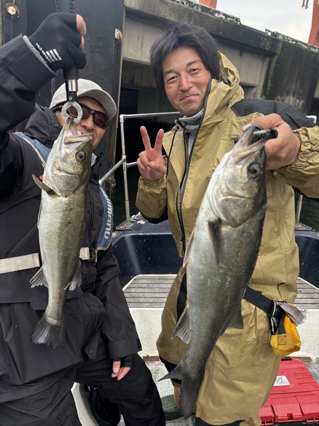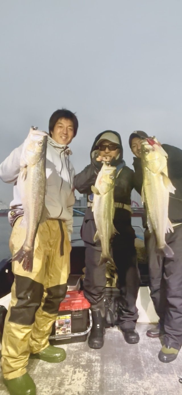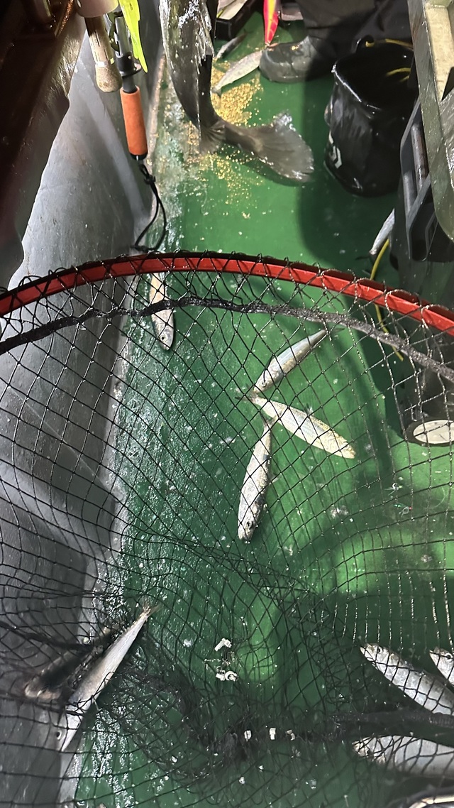 (スズキ)40~75cm 合計35匹 Night便乗合2号艇石井ちゃん Nightは乗合で出船! 最近Nightの調子が良いので気合入れてスタート! まずは昼間に撃沈したポイントから。 でもNightは違うんだよなー、やっぱり食う! イワシとコノシロが混ざったエリアで、開始早々からポツポツとヒット! ビッグベイトやミノーにしっかり反応してくれて、途中にはダブルヒット、トリプルヒットも出てお祭り状態! 合間にイワシ釣りなんかもしつつ、わちゃわちゃ楽しい展開に。 上手な方は終始しっかり魚掛けてました! ラストは船の周りがイワシのナブラだらけ! 網で掬えるくらい湧いて、そんな中スラスイ250でまさかの入れ食い! なんだかんだで最高に盛り上がったNightでした! 個体も太く良型揃い。 この爆発パターン、いつまで続くか分かりませんが…今がチャンス! 早めのご予約おすすめです!!