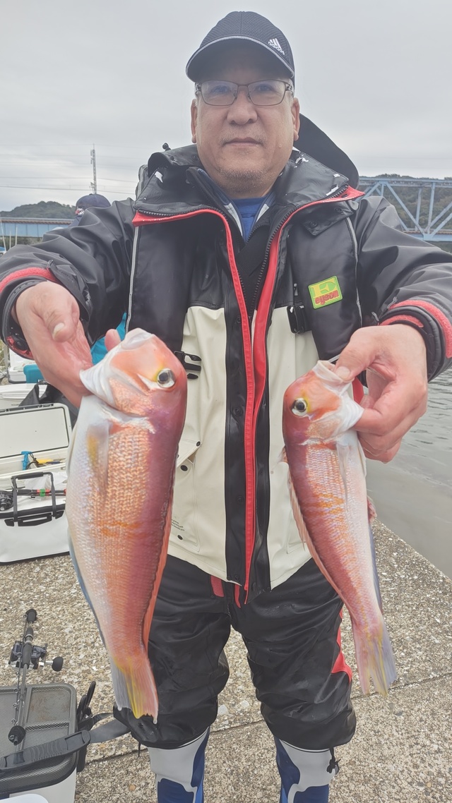 (イトヨリダイ)25~40cm 1~7匹 アジ 30~40cm 0~8匹 シロアマダイ 36cm 合計1匹 アカアマダイ 25~42cm 0~3匹 クロダイ 35cm 合計1匹 アジ・アマダイ五目乗合で、前半 アジから始めて、ポツリポツリと 顔出しましたがバラシもアリおかず 程度でした。 後半アマダイは、風強く風裏でイトヨリ主体でシロアマダイ顔見れて、 沖目レンコダイ、イトヨリ、アカアマダイも喰って上げ潮から移動して ポツポツとアマダイゲット出来ました。船中10匹