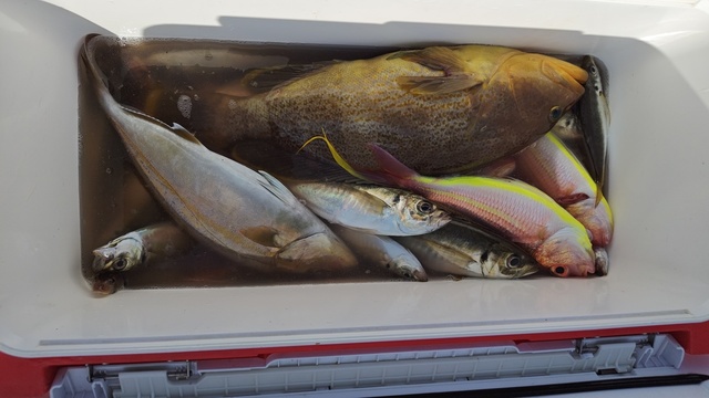 (イトヨリダイ)24~36cm 1~7匹 アジ 16~28cm 12~34匹 ショゴ 40cm 合計1匹 イナダ 40cm 合計1匹 アカアマダイ 42cm 合計1匹 アオハタ 2.00kg 合計1匹 アジ・アマダイ五目乗合で、朝アジ から始めて、小アジ主体でポツリ ポツリと喰って中アジも少し混じり イナダ、ショゴも顔見れました。 後半アマダイは、イトヨリポツポツ と喰ってアオハタの2キロと外道の 活性良く後半深目て何とかアマダイ 顔見れました。