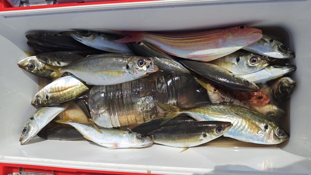 (イトヨリダイ)26~45cm 0~2匹 シロアマダイ 38~44cm 0~2匹 アカアマダイ 37~40cm 0~1匹 アジ 16~22cm 24~72匹 アジ・アマダイ五目乗合で朝アジ から始めて、活性良く小アジ主体で 手の良い方ダブル、トリプルと 喰ってました。潮止まり前にデカ アジトライしましたが、サバフグ で顔出しませんでした。 後半アマダイは、早々にシロアマダイ顔見せて、ジャンボイトヨリ、 アカアマダイとボチボチでした。